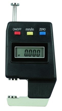 This micrometer (thickness gauge) is perfect for measuring paper, paperboard, film, and foil thicknesses. Reads inch or metric at the touch of a button. Bright 3/8 LCD displays in .0005 increments or in .01mm increments. On/off switch or automatic shut-off to extend battery life. SR-44 button battery included. Protective, cushioned, hard-shell case. Weighs only 4 oz.Range: 0-1" and 0-25.4mm Resolution: .0005"/.01mm Overall Size: 4" x 2.5" x 3/4" Country of Origin: China